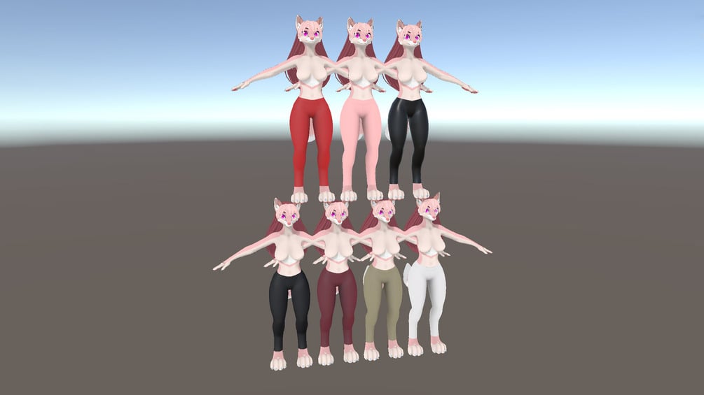 You'll get a set (7) of leggings for Winterpaw's VRChat Fem Canine base. A unitypackage file and an FBX file (made in Blender).