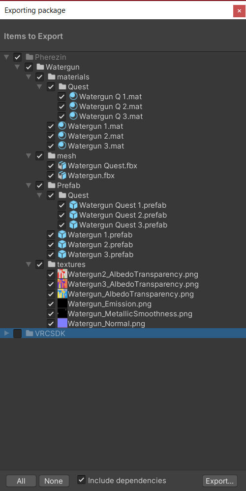 A Unitypackage file of the watergun that includes 6 Prefabs (3 for PC, 3 for Quest) 2 meshes, and 6 texture files.