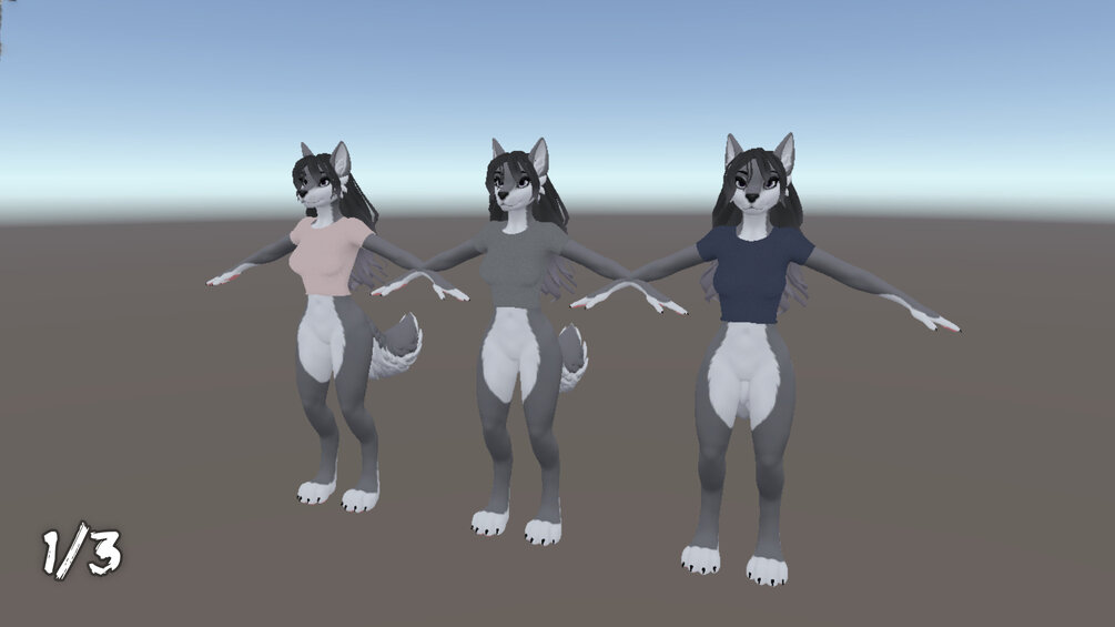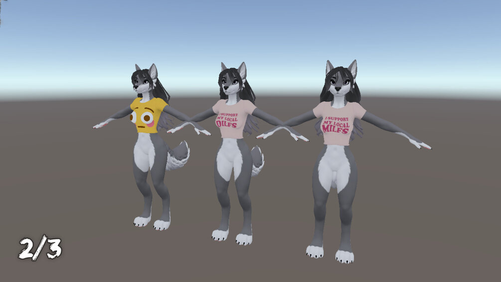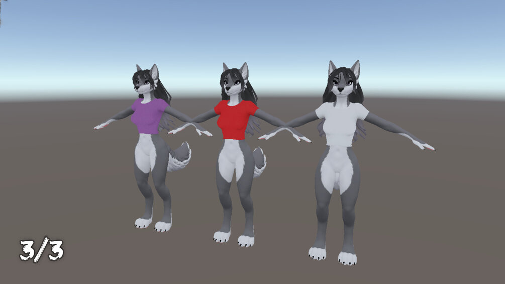 A crop top for Winterpaw's VRChat and VTuber Fem Canine! Supports Quest and includes 9 different colors! It is very simple to set up. Just drag the prefabs into one of the avatars in the default scene and upload!